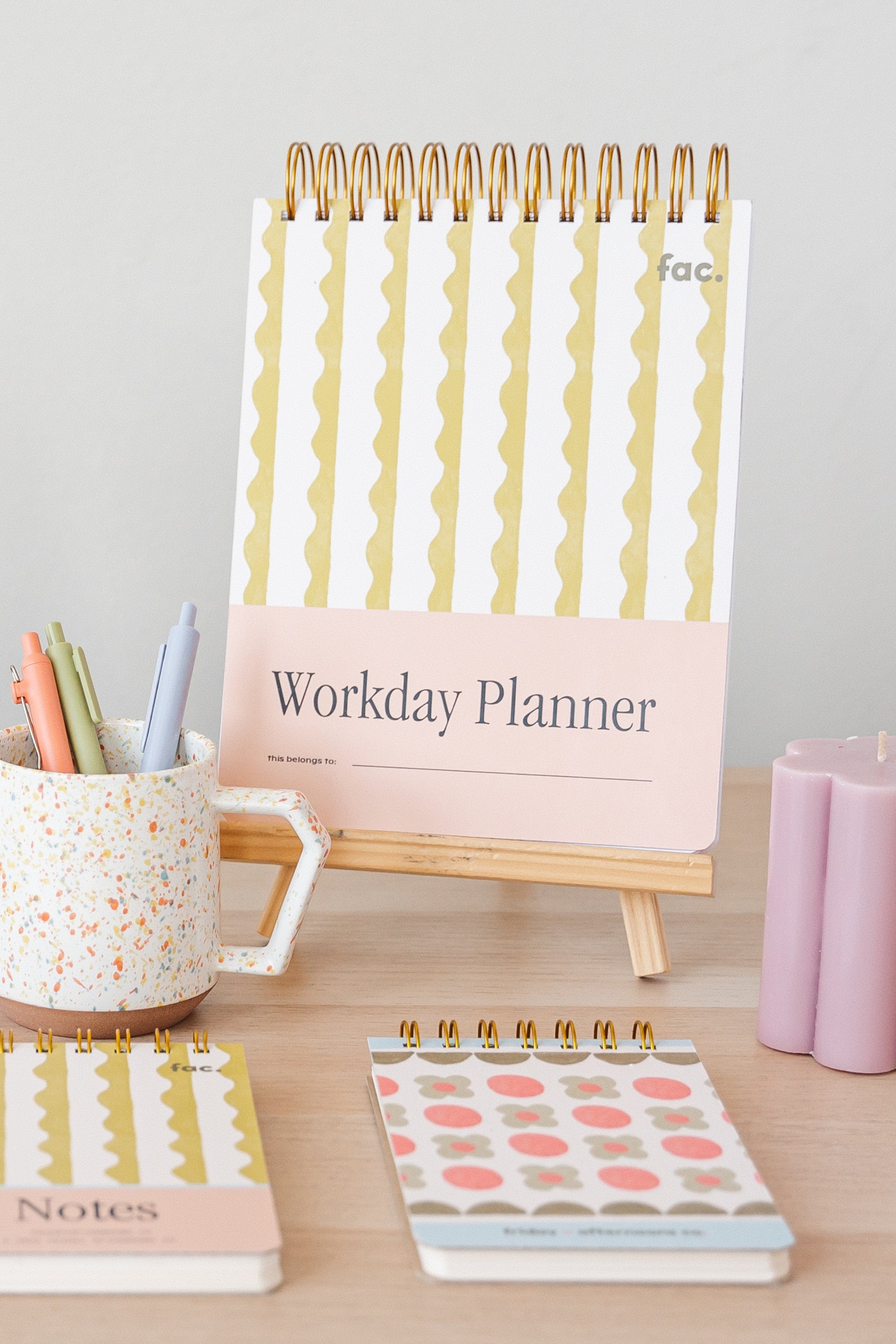 The Workday Planner is a daily planner designed for busy professionals, working moms, and women who want simple, effective tools to manage their workday. Each planner includes time-blocking, work and personal task lists, undated pages, and a calming minimalist layout.